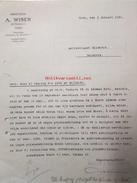 Osakeyhtiö A. Wisen Aktiobolag Wasa, Wasa 3. januari 1921 -asiakirja