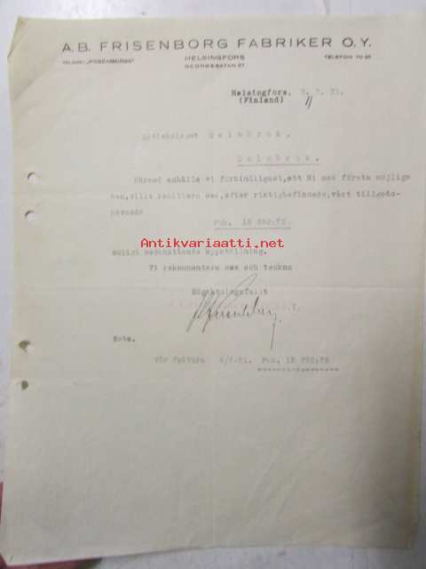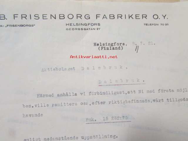 A.B. Frisenborg Fabriker O.Y Helsingfors, Helsingfors 8.7. 1921 -asiakirja