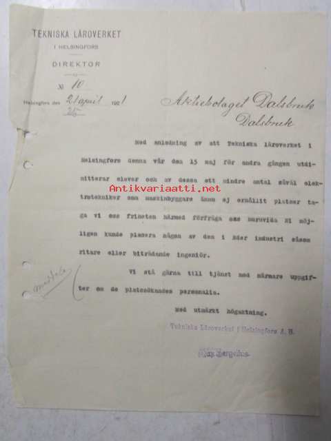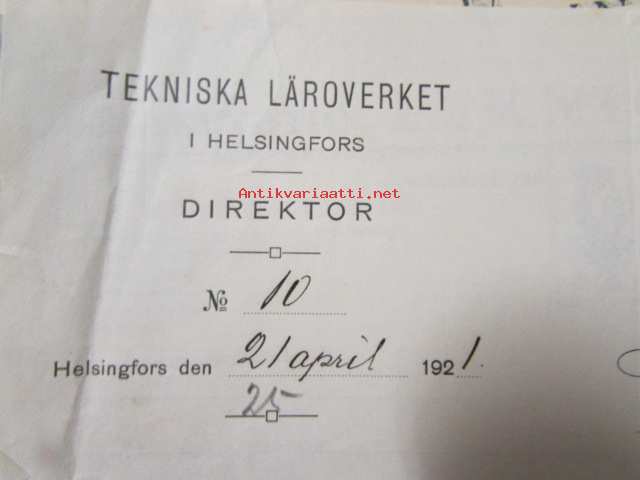 Tekniska Läroverket, Helsingfors 21. april 1921. -asiakirja
