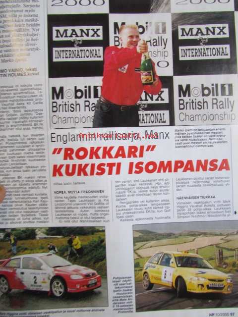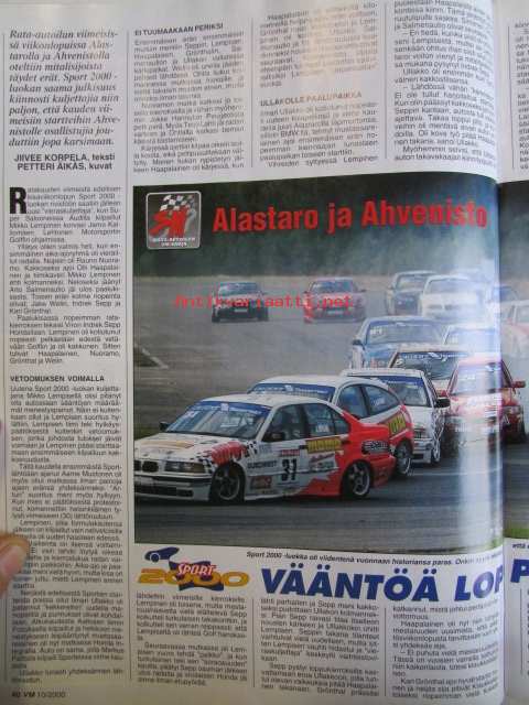 Vauhdin Maailma 2000 nr 10 -mm. Formula 1 MM Belgia, Italia ja USA, Karting-MM Portugali Kovalainen ajoi historiaan, Rata-SM Alastaro ja Hämeenlinna ratkaisuviikonloput, Ralli MM Kypros bossen pistejohto säilyi, Ralli-SM Uusikaupunki ja Hämeenlinna, Ralli-SM Naiset ja nuoret Turenki - Raisio mestarit erottuivat, VM keltainen, Rallivisan vastaukset ja parhaat tietäjät, Varikolla kuiskitaan, Tulospörssi, Katsastusruudut, Englannin avoin rallisarja Ipatti uusin suomalaissankari, Formulan-ryhmä Cup Mäntyharju junnut hämmästyivät vauhdillaan, Rallisprint-SM Mynämäki ja Huittinen kymmenvuotinen kultajahti, Drag-SM Alastaro lentokelin mestarit Drag-EM ja -PM suomalaisjuhlaa.21 x 29 cm.
