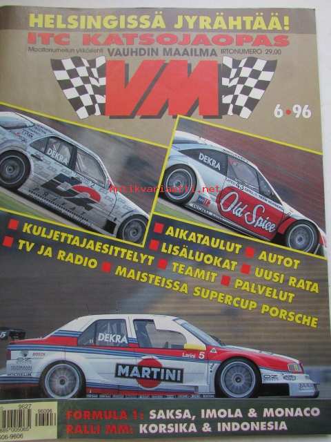 Vauhdin Maailma 1996 nr 6 -mm. Formula 1 GP:t Eurooppa ja San Marino ja Monaco, Kotimaan ratatestipäivät Sport 2000 ja SS-luokat, VM esittelee kemiläisen Esort