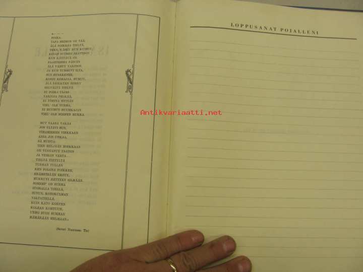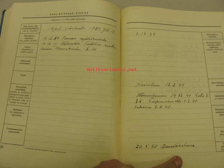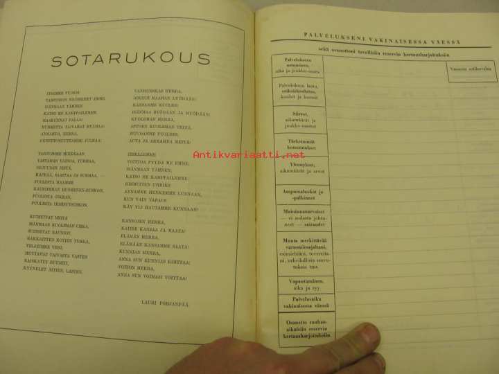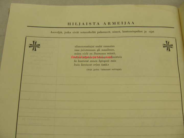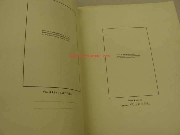 Heti jatkosodan alkuun valmistunut muistojen kirja sotilaille. Tähän saattoi koota sota-ajan tärkeät tapahtumat, valokuvat jne. Vain vähän täytetty. Hivenen nuhruinen, repeämä yhdellä sivulla.