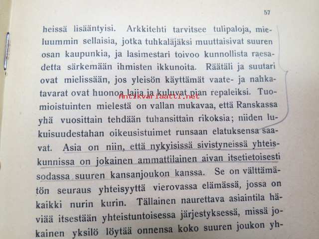 | Saatavilla | 1 kpl | | Julkaisuvuosi | 1920 | | Sivuja | 285 | | Painos | 1. | | Kunto | K2 | | Runsaasti merkintöjä | | Sidonta/painoasu | Sidottu (kovak.) | | Kielet | Suomi |