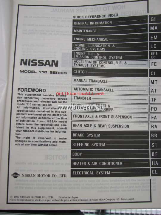 Nissan Y10 service manual supplement IV -korjaamokirjan lisäosa