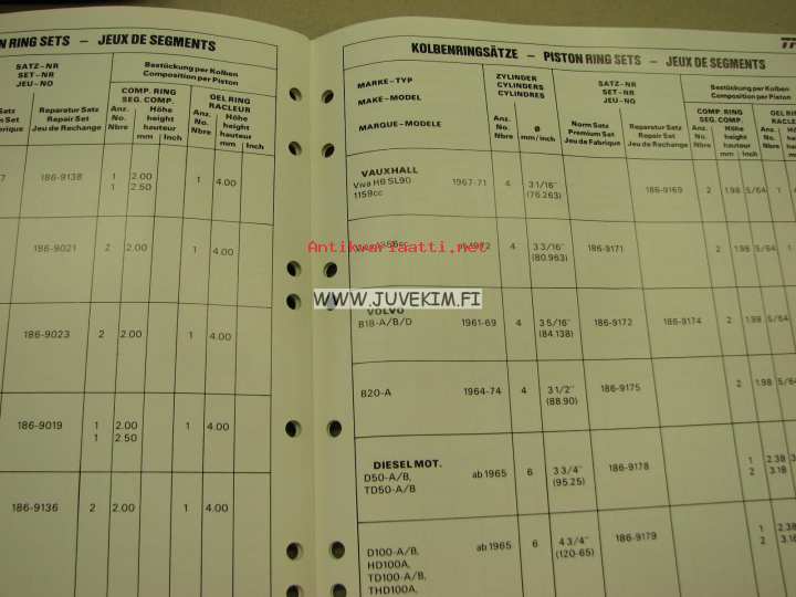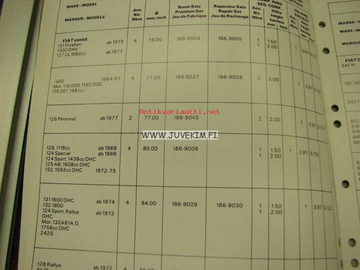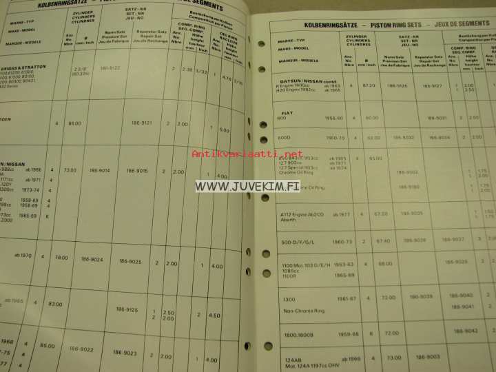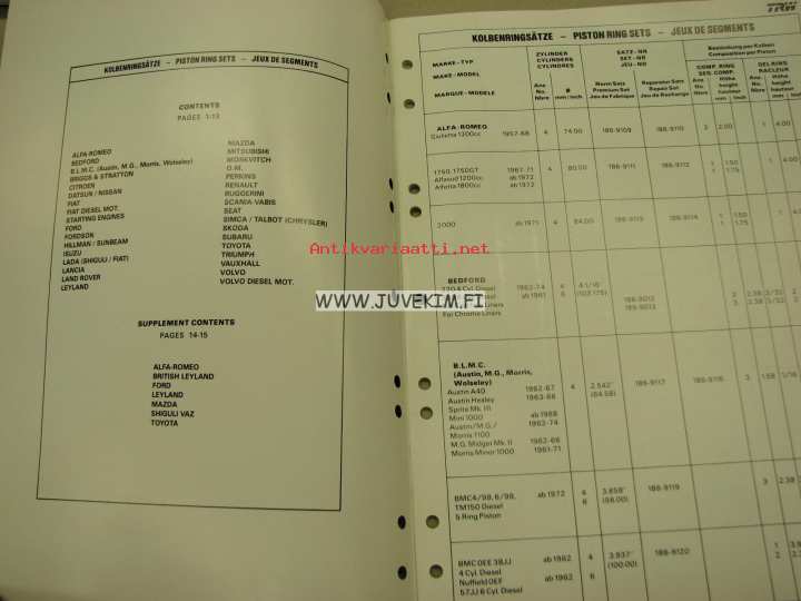 TRW piston ring sets / männänrenkaat -tuoteluettelo