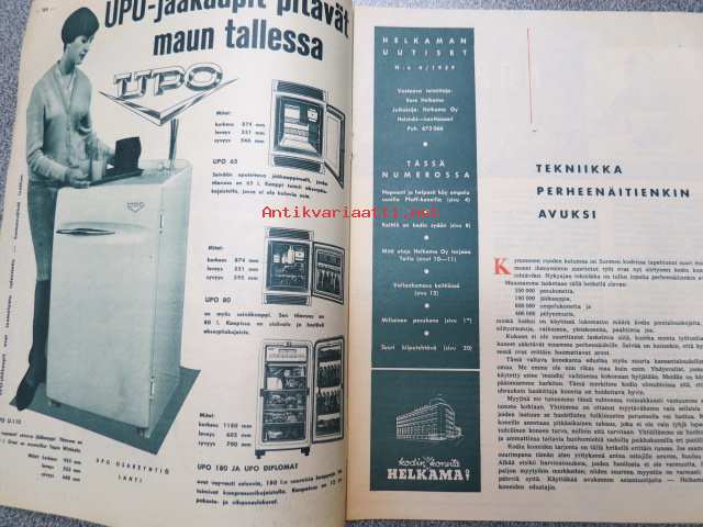 Helkama Oy, 1959Helkaman Uutiset 1959 nr 4 -sis. mm. seur. artikkelit / kuvat / mainokset; Pfaff-ompelukoneet, Keittiö on kodin sydän, Mitä etuja Helkama Oy tarjoaa teille, Vallankumosu keittiössä, Millainen pesukone? ym. koneellistuvaan kotitalouteen liittyvää asiaa