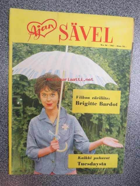 Ajan Sävel 1961 nr 34, sis. mm. seur. artikkelit / kuvat; Kaikki puhuvat Tuesdaystä, Brigitte Bardot (väriliite puuttuu), Ruotsalaiset nuoret rikolliset,