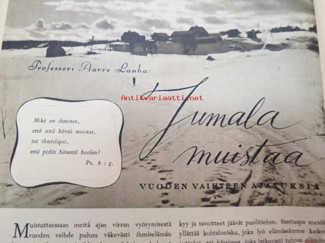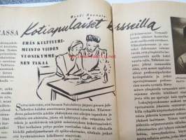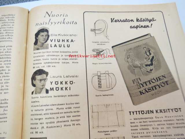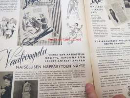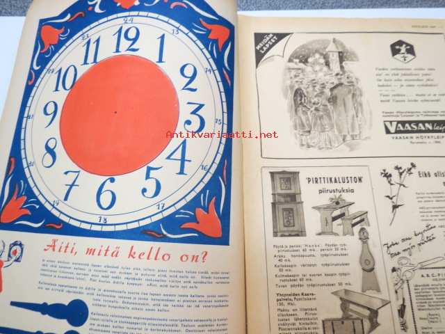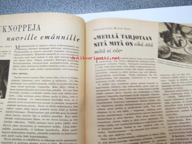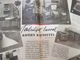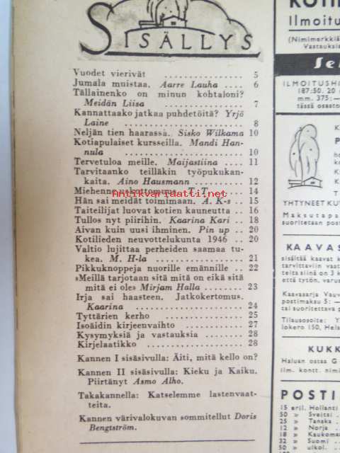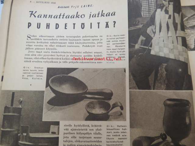 Kotiliesi 1946 nr 1, sis. mm. seur. artikkelit / kuvat / mainokset; Kellotaulu vaneriin liimattavaksi sivulla 2, Vaateompelu - naisellisen näppäryyden näyte - Sorjakaavat, Jumala muistaa - vuodenvaihteen ajatuksia, Arkkitehti Yrjö Laine - Kannattaako jatkaa puhdetöitä?, Aino Hausman - Tarvitaanko teilläkin työpukukankaita?, Anni Collan 70 vuotta, Taiteilija luovat kotein kauneutta mm. Paavo Tynell - Alli Koroma -Ilmari Tapiovaara - Eeva Kauppinen - Margareta Ahlstedt-Willandt - Pian Söderström - Liisa Taimi - Kai Franck (Toto-lelut), Pikkuknoppeja nuorille emännille, Onko sinulla oikeat silmälasit, ym. 21 x 29 cm.