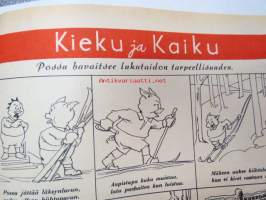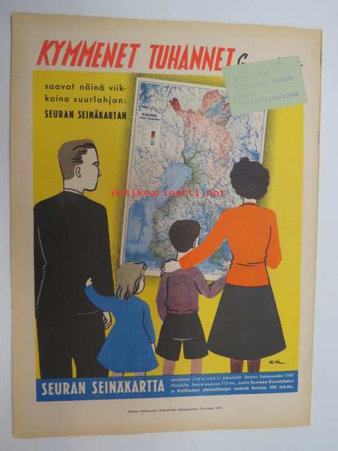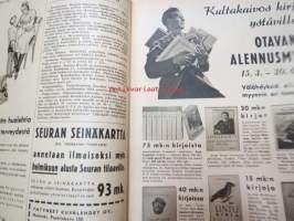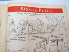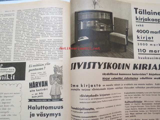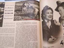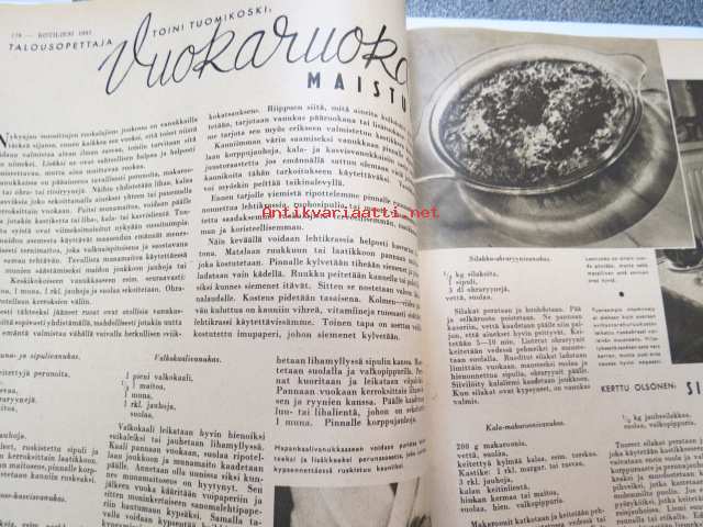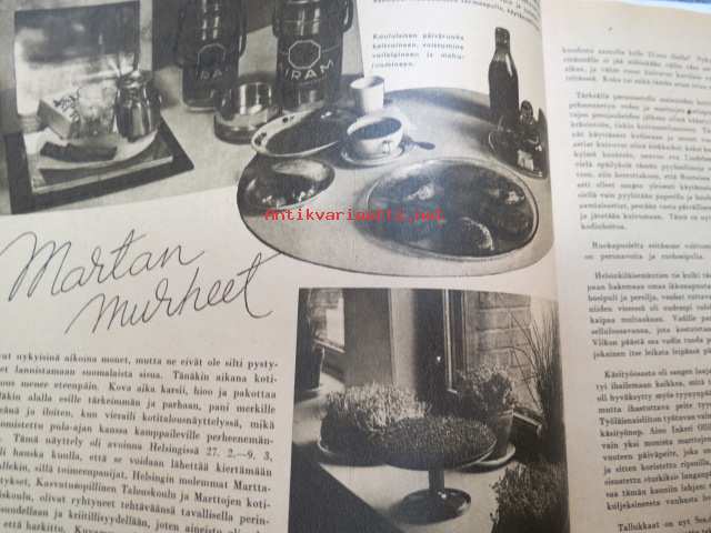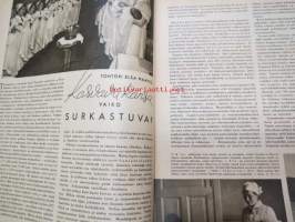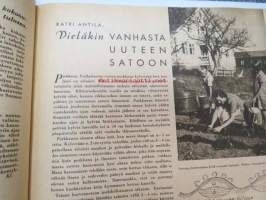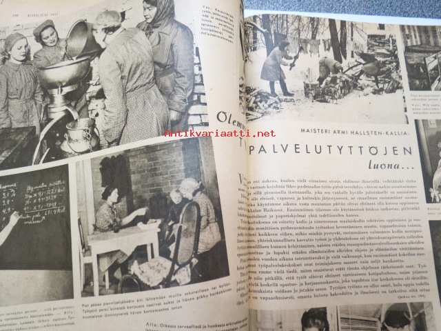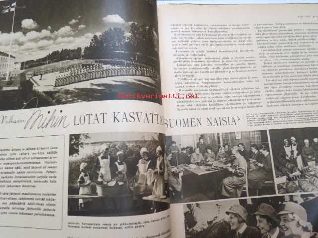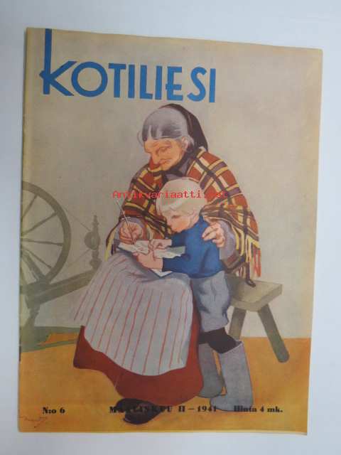 Kotiliesi 1941 nr 6 maaliskuu II sis. mm. seur. artikkelit / kuvat / mainokset; Kansikuvitus Martta Wendelin, Leposohvasta loihditaan oikea sänky, Kasvava kansa vaiko surkastuva?, Martan murheet, Aino Valkama - Mihin lotat kasvattavat Suomen naisia?, Vuokaruoka maistuu, Armi Hallsten-Kallia - Olemme työpalvelutyttöjen luona, Kevään ja kesän pukimia -mallisto, Kieku ja Kaiku, seuran seinäkartta, ym.21 x 29 cm.