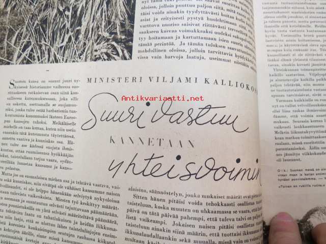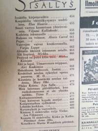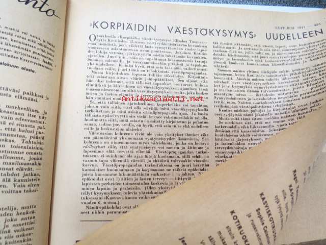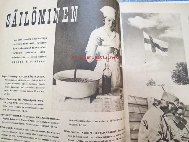 Kotiliesi 1941 nr 14-15 heinäkuun II - elokuun I sis. mm. seur. artikkelit / kuvat / mainokset; Kansikuvitus Martta Wendelin, Lea Vehmanen - Virike-ryijy, Säilöminen, Suuri vastuu kannetaan yhteisvoimin, Kodeista isänmaalle - kaatuneitten sotilaiden äitien esittelyä, Tohtori Varpu Leppo - vauvojen vaivat kesäkuumalla, Alttarin äärestä isänmaan asialle, Äiti ja lapsi - uimarannan reippaat, Mary Olki - Reikäompelu on kaunista taidetta, Kultamuuraimet, Kypsyvät marjat, Lehmän herkkua, Kieku ja Kaiku, Atamon, ym.21 x 29 cm.