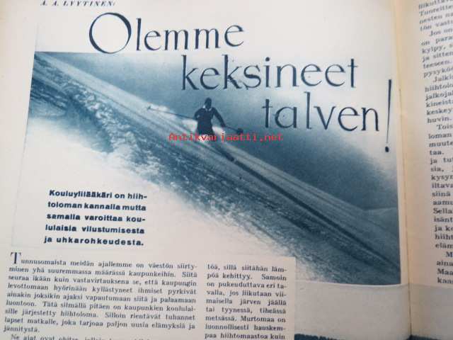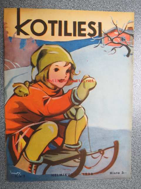 Kotiliesi 1938 nr 3, helmikuu I, sis. mm. seur artikkelit / kuvat / mainokset; Kansikuva Martta Wendelin( Tyttö ja kelkka) Kirjoituslipasto teko-ohje sivulla 2,