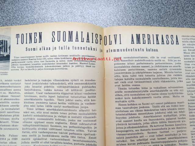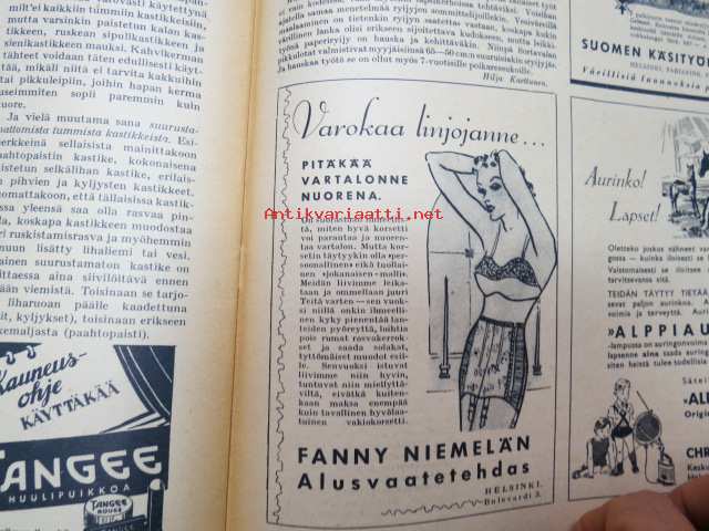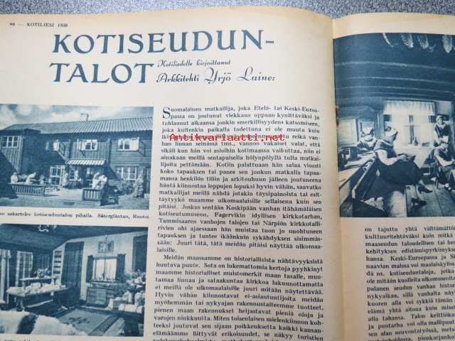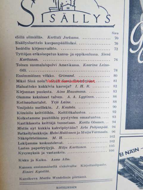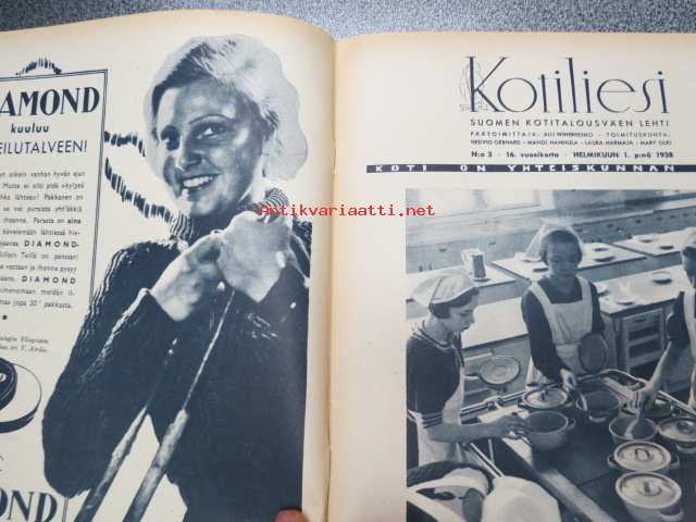 Kotiliesi 1938 nr 3, helmikuu I, sis. mm. seur artikkelit / kuvat / mainokset; Kansikuva Martta Wendelin, Kirjoituslipasto teko-ohje sivulla 2, Diamond pakkasrasva, Tyttöjen erikoisopetus kansa- ja oppikoulussa, Toinen suomalaispolvi Amerikassa, Kirjonnan puolesta, Kotiseuduntalot, Vesijohto meillekin, Astiainkuivaustelineen työpiirustukset, Nivea, Fanny Niemelän alusvaatetehdas, Kieku ja Kaiku, Havi Silva pesuaine, ym.21 x 29 cm.