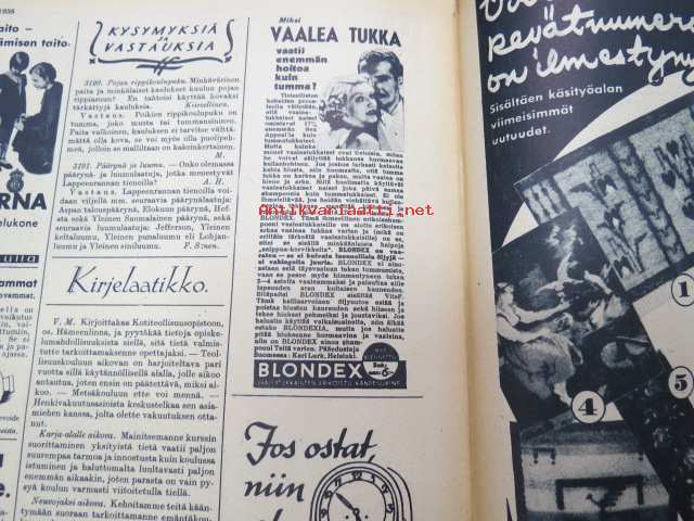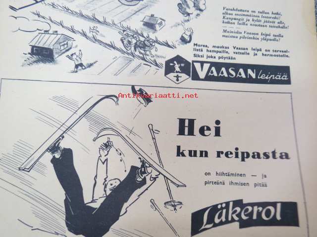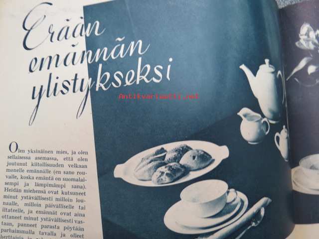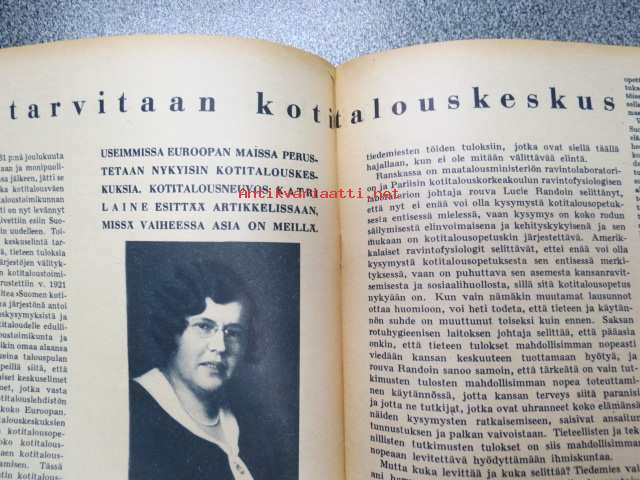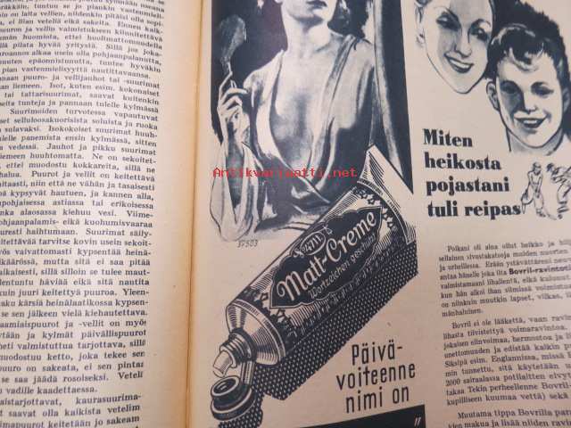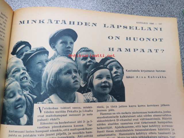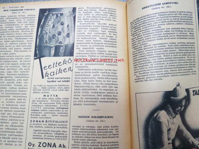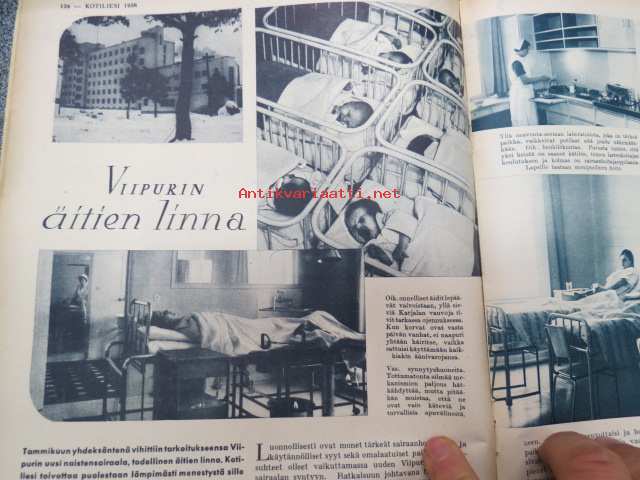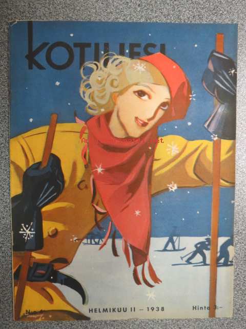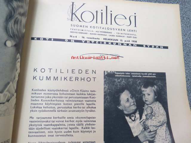 Kotiliesi 1938 nr 4, helmikuu II, sis. mm. seur artikkelit / kuvat / mainokset; Kansikuva Martta Wendelin, Kodin lääkekaappi teko-ohje sivulla 2, Vaasan leipää, SVUL Urheiluarpajaiset, Meillä tarvitaan kotitaoluskeskus, Kahdeksassa pitäjässä kotitaloudenneuvontaa katsomassa, Viipurin äitien linna (Viipurin uusi naistensairaala), Minkätähden lapsellani on huonot hampaat, Entä virkanaisen työpuku?, Hienen liinavaatteen salaisuus, Näin minä lämmitän saunan, Herkullinen aamupuuro, Me hankimme rahaa vähittäismaksulla - KOP, Kieku ja Kaiku, Havi Teho puhdistusaine, ym.21 x 29 cm.