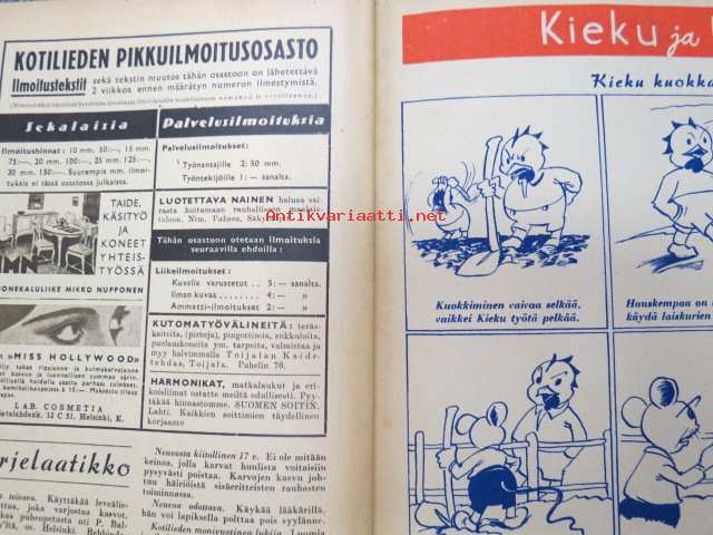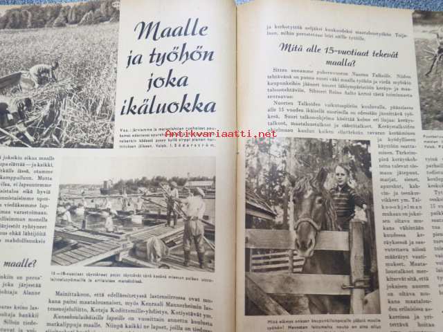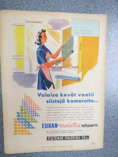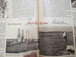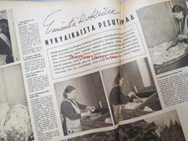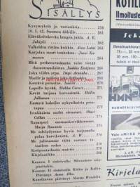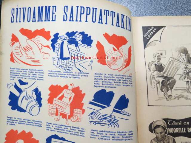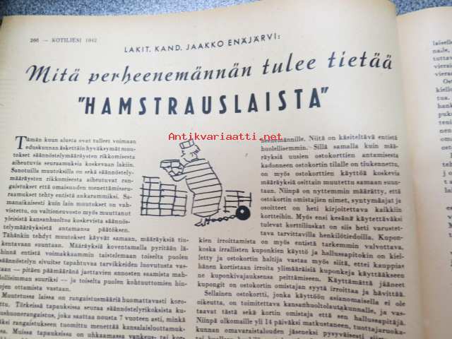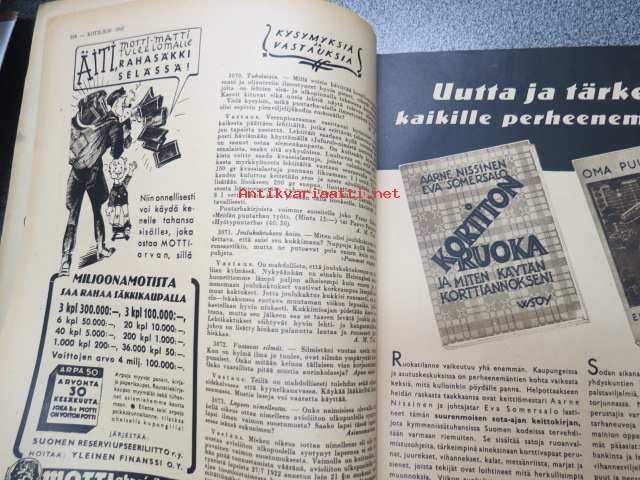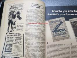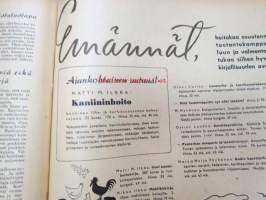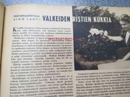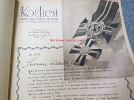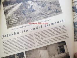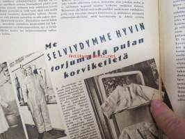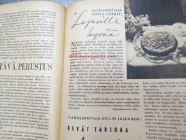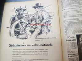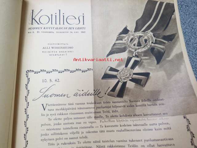 Kotiliesi 1942 nr 9, toukokuu I, sis. mm. seur artikkelit / kuvat / mainokset; Kansikuva Martta Wendelin, Siivoamme saippuattakin, Valkeiden ristien kukkia, Jussi Komonen - Karjalan suuri toukokuu, Mitä perheenemännän tulee tietää hamstrauslaista, Maalle ja työhön joka ikäluokka, Emämntä kokeilee nykyaikaista pesutupaa, Istukkaista uudet siemenet, Me selviydymme hyvin torjumalla pulan korviketietä, Sota täitä vastaan julistettu, Kieku ja Kaiku, Euran Paperi - vahattu hyllypaperi, ym.21 x 29 cm.