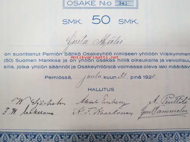 Perniön Sähkö Oy, Perniö 1920, 50 mk, osake nr 141, Gusta Mäki -osakekirja