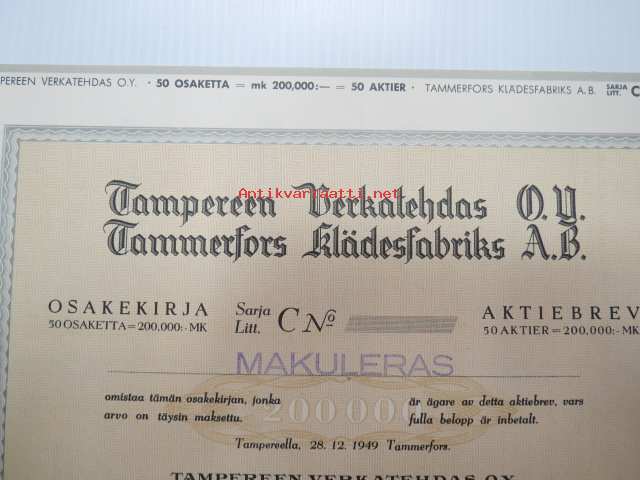 Tampereen Verkatehdas Oy, Tampere 1949, Sarja C 50 osaketta á = 200 000 mk -osakekirja, blanco, makuleras-leimattu
