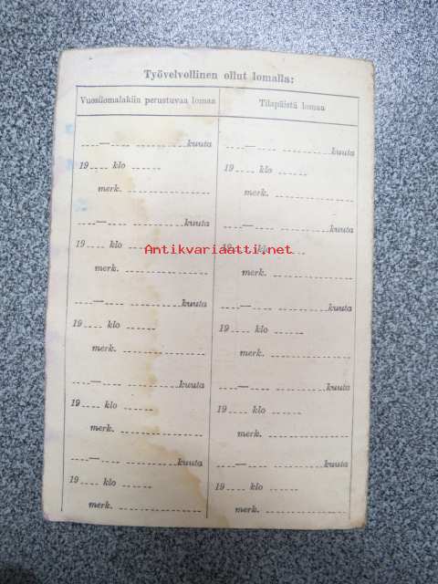 Koululaisen työkirja 8.7.1943, Sirkka Heinistö, Turun tyttökoulu, määrätty työhön K. Lahdelmalle Piikkiöön