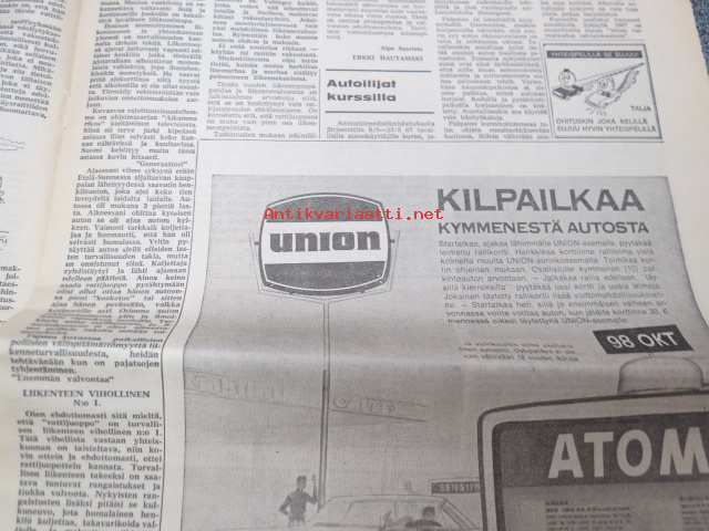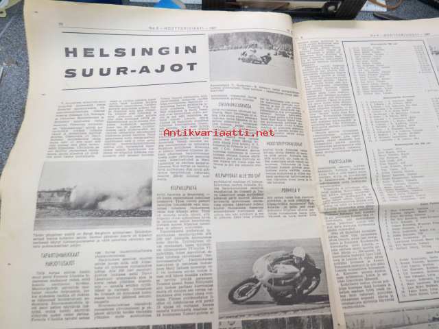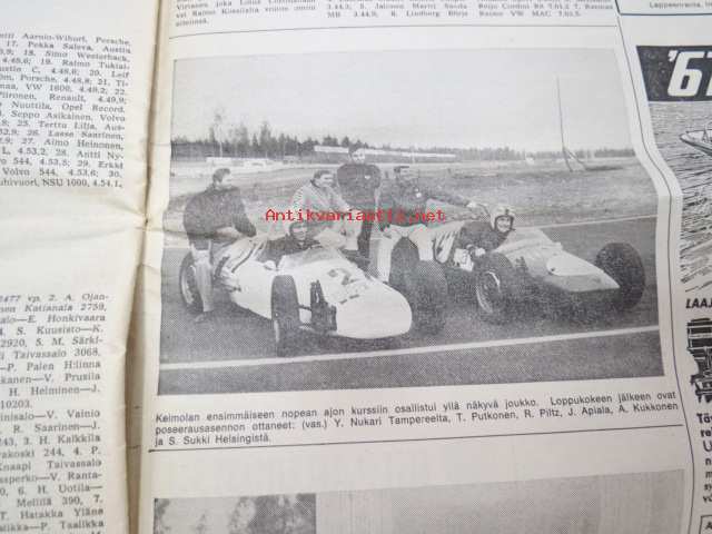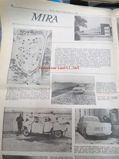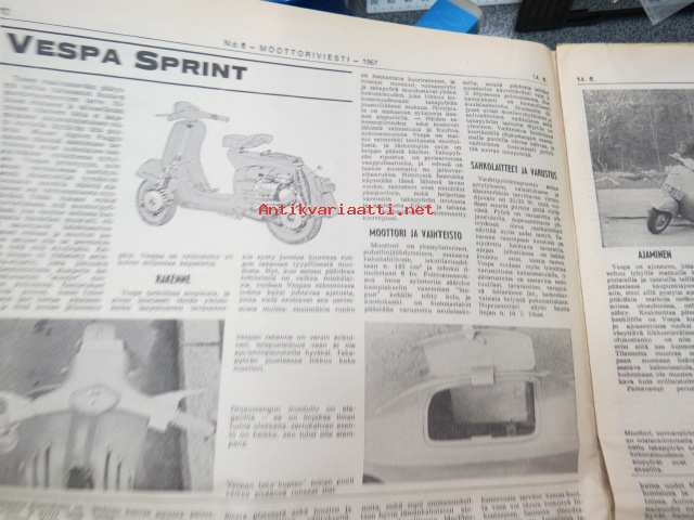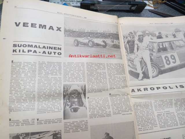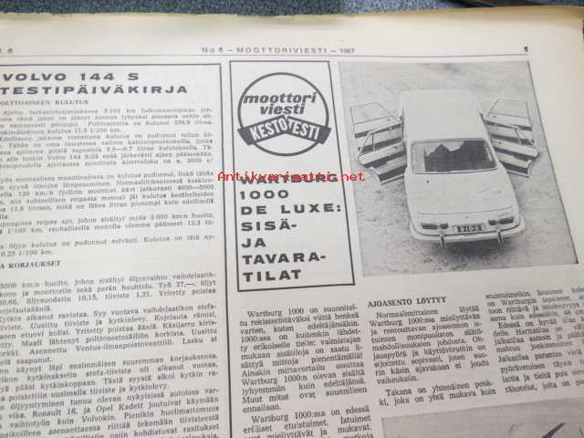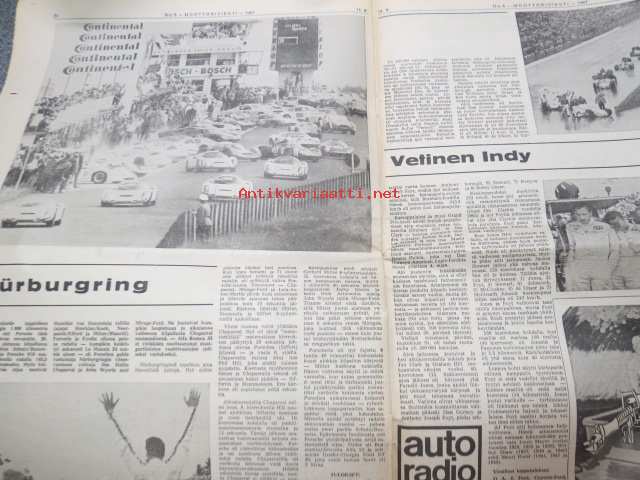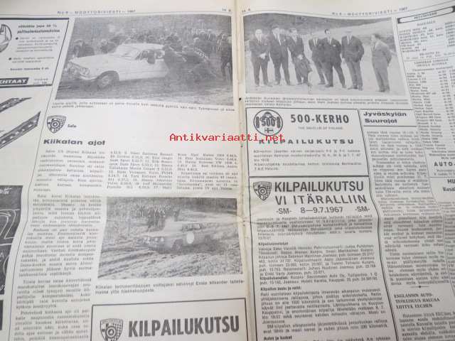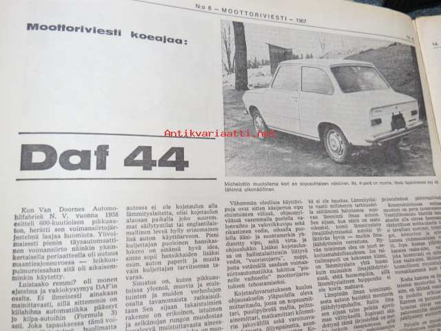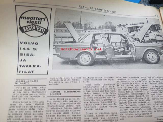 Moottoriviesti 1967 nr 6, ilmestynyt 14.6.1967, sis. mm. seur. artikkelit / kuvat / mainokset; Kansikuva Datsun 1300, Kestotesti Volvo 144 S, TAunus 15 M, Daf 44 koeajo, Vespa Sprint koeajo, Union Atomi, MIRA testiradat ym. Englannissa, Detroit - Vanhan Henryn museo, Helsingin Suurajot, Veemax - suomalainen kilpa-auto, Akropolisralli, Nürburgring, Vetinen Indy, Salpausselkä, Väinölänniemi, North State, ym. 27 x 42 cm.