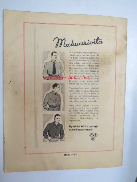 | Saatavilla | 1 kpl | | Julkaisuvuosi | 1936 | | Sivuja | 40 | | Kunto | K2 | | Sidonta/painoasu | Nidottu (pehmeäk.) | | Kielet | Suomi |