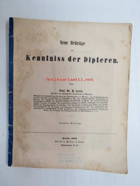 Neue Beiträge zur Kentniss der Dipteren, Fünfter Beitrag, Berlin 1857 -saksankielinen hyönteistieteellinen tutkimus -scientific publication in german