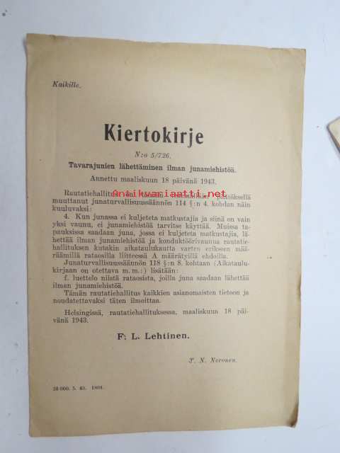 Tavarajunien lähettäminen ilman junamiehistöä - Valtionrautatiet, 18.3.1943