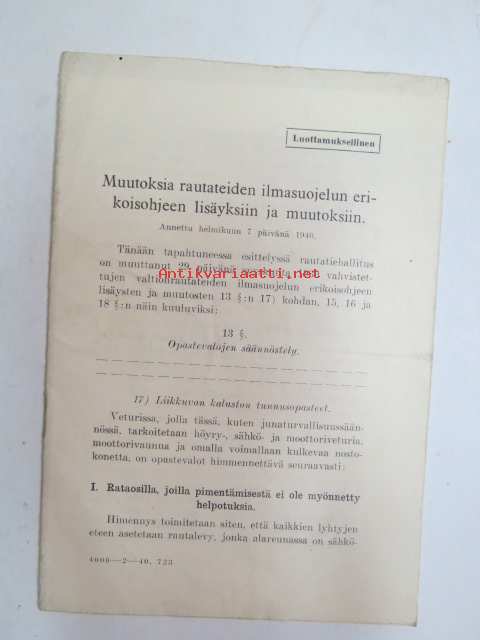 Muutoksia rautateiden ilmasuojelun erikoisohjeen lisäyksiin ja muutoksiin, 7.2.1940 - Valtionrautatiet