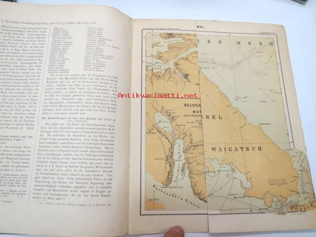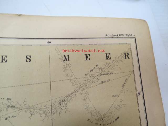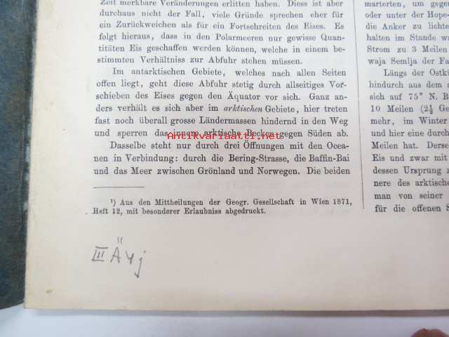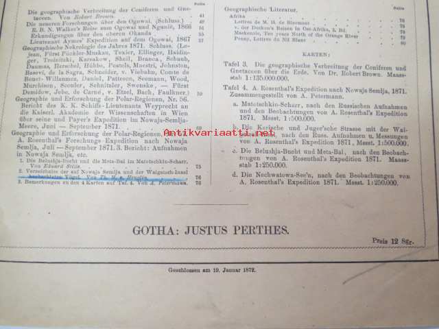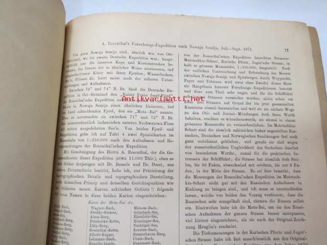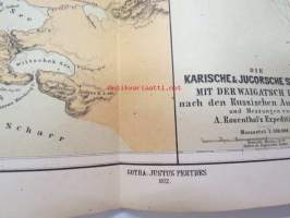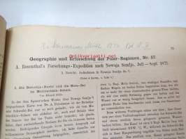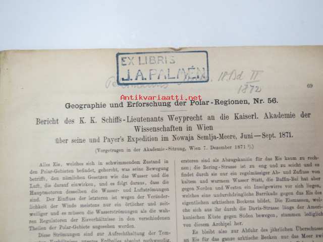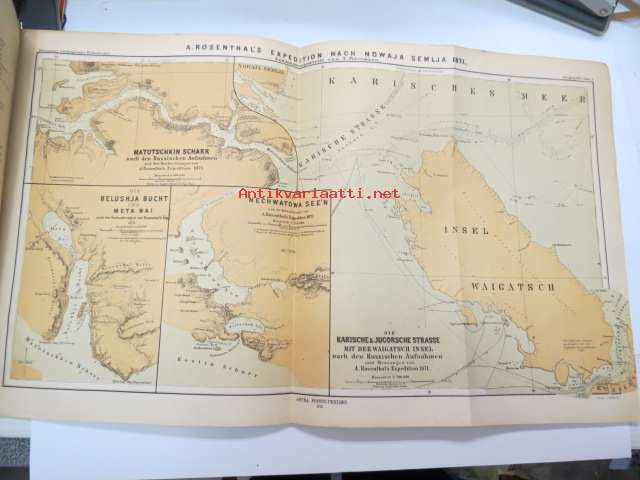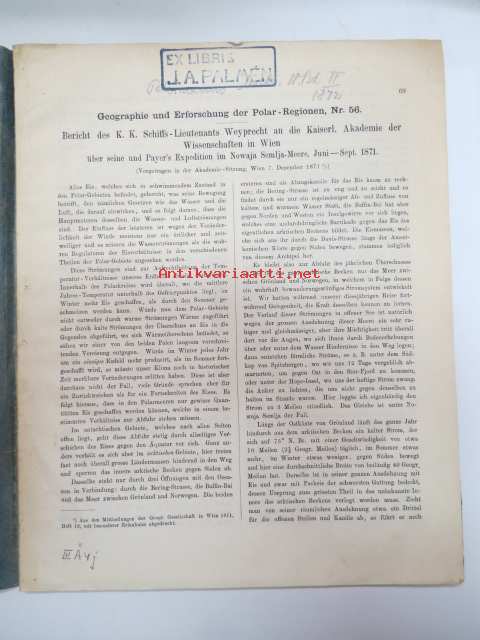 Kaiserl. Akademie der Wissenschaften in Wien, 1872 Geografie und Erforschung der Polar-Regionen, nr 56 - Bericht des K.K. Schiffs-Lietenants Weyprecht an die Kaiserl. Akademie der Wissenschaften in Wien über seine und Payer´s Expedition in Nowaja Semlja-Meere, Juni-Sept. 1871 / Geografie und Erforschung der Polar-Regionen, nr 57. A. Rosenthal´s Forschungs-Expedition nach Nowaja Semlja, Juli-Sept. 1871 (I Die Belushja-Bucht und die Meta-Bai im Matoschkin-Scharr, von Eduard Stille, II. Verzeichniss der auf Nowaja Semlja und der Waigatsch-Insel beobachteten Vögel, von Th. v. Heuglin, III Bemerkungen zu den vier Karten auf Tafel 4., von A. Petermann, with map, 1872 -2 osaa pohjoisten alueitten tutkimuksen tieteellistä julkaisusarjaa, kartta mukana - Novaja Zemlja, painettu 1872 22 x 28 cm.