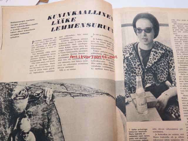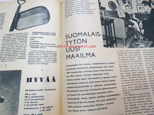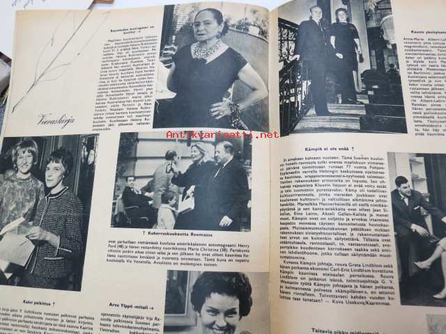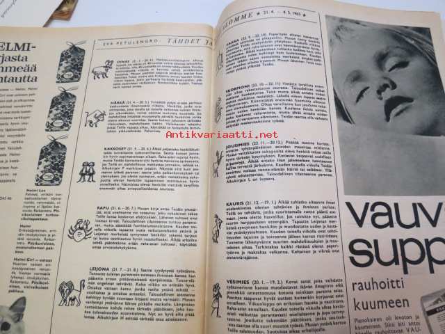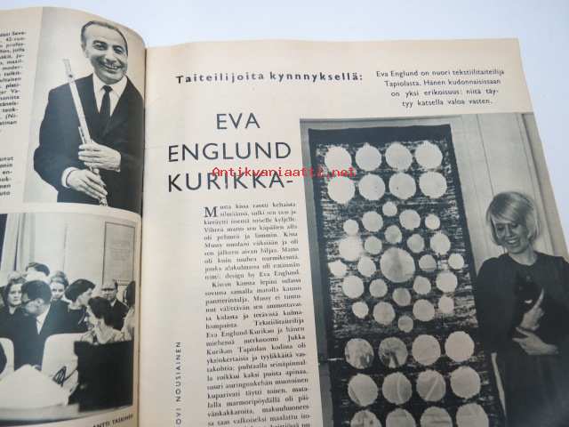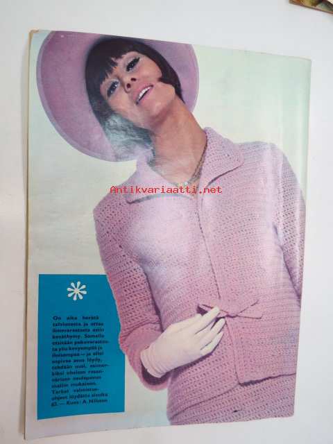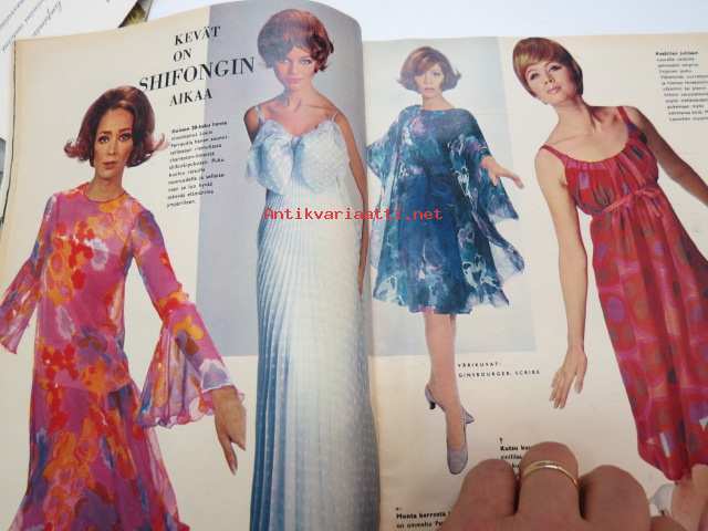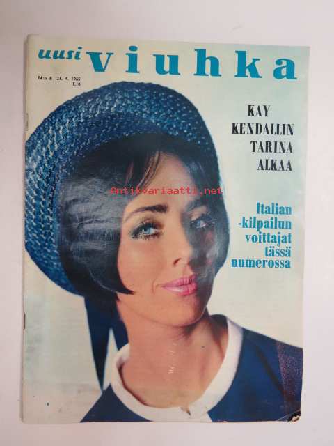 Valiolehdet Oy, 1965Uusi Viuhka 1965 nr 8, ilmestynyt 21.4.1965, sis. mm. seur. artikkelit / kuvat / mainokset, Kay Kendallin tarina alkaa, Jos miehenne on alkoholisti..., Kevät on shifongin aikaa, Eila Pennanen - Keväthinku, Taiteilijoita kynnyksellä - Eva Englund, Kuusinen 50 vuotta muotia, Kalasäilykeet käyttöön, Tita Vuori PAA:n lentoemännäksi ja naimisiin New Yorkiin, Kengässä on romantiikkaa, Runoilija Jyrki Pellinen, ym.