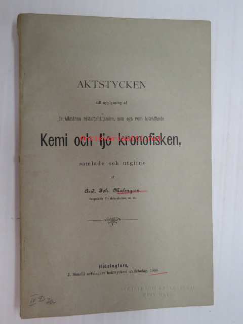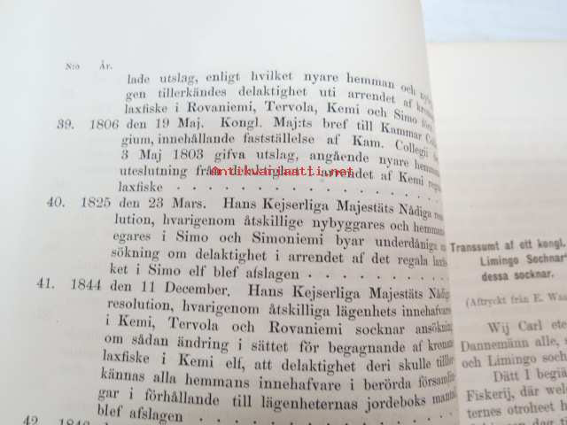 Aktstycken till upplysning af de allmänna rättsförhållanden, som äga rum beträffande Kemijoki och Ijo kronofisken, 1888 Kemi- ja Iijoen kalastusta koskevat asetukset koottuna kronologisesti 1607-1882 -fishing rules and regulations of the namde rivers