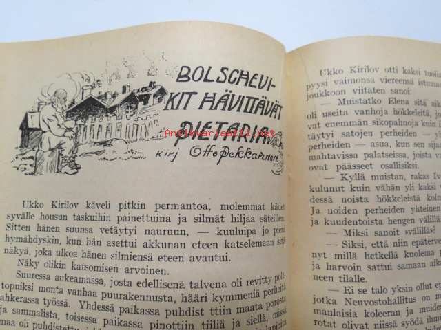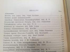Työmiehen Kalenteri I 1922, sis. mm. seur. artikkelit / kuvat / mainokset; Kansikuvitus sekä kalenteriosan vinjettikuvitus I. Vickberg; Ikuinen muisto kommunaareille, Amerikan Yhdysvaltain finanssikapitalismi, Bolshevikit hävittävät Pietaria, Vallankumous valtaa alaa, Riisitauti ja vitamiinit, Pakinaa etunimistämme, Luonnonkansojen häviämisen syyt, Yleinen opetus Neuvosto-Venäjällä, K. Kivi - Vähän suuntariidoista, Tohtori N.R. Ursin maanpakolaisena, Klubitoiminnasta Neuvosto-Venäjällä, O.V. Kuusinen - Strategiamme, Amerikan suomalaisesta työväenliikkeestä, Valtiollisen vainon uhrit, Metrinen mittajärjestelmä, ym. -left wing calendar