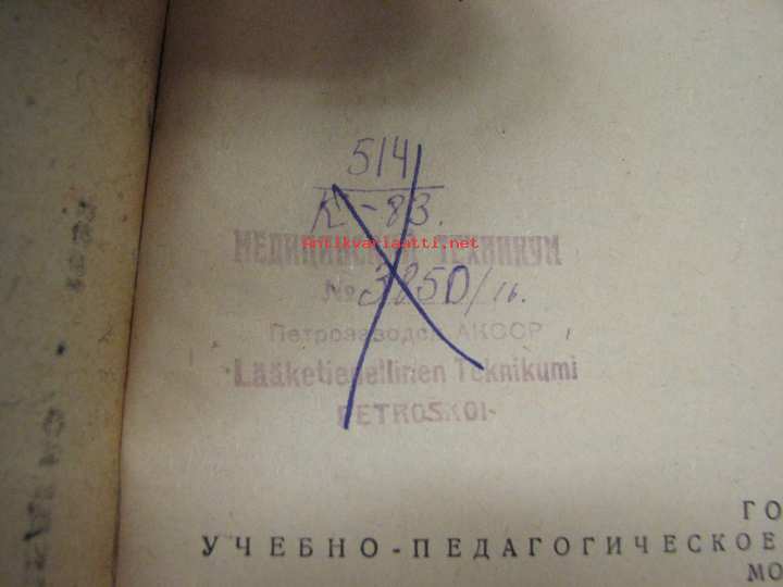 Krogius V. A., Gosudarstvennoje uzebno-pedagogitseskoe isdatelstvo, 1932 15 x 23 cm kirja. Petroskoin Lääketieteellisen Teknikumin leima.