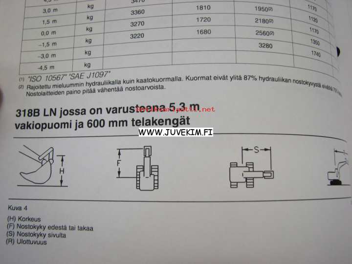 Caterpillar 318B L, 318B LN kaivinkone -käyttöohjekirja, täydentäviä tietoja, lisäohjeita nostokyvyistä varsinaisen käyttöohjekirjan lisäksi