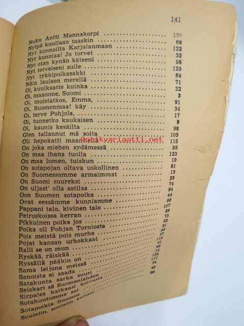 | Saatavilla | 1 kpl | | Julkaisuvuosi | 1943 | | Sivuja | 142 | | Painos | 12. | | Kunto | K2 | | Sidonta/painoasu | Nidottu (pehmeäk.) | | Kielet | Suomi |