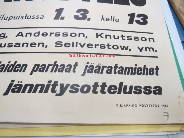 Ruotsi-Suomi jäärata (jääspeedway) maaottelu Turun urheilupuistossa 1.3.1959 Bramberg, Andersson, Knuttson, Pajari, Jousanen, Seliverstow -juliste / poster