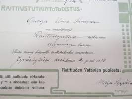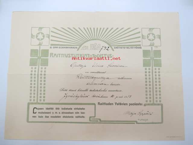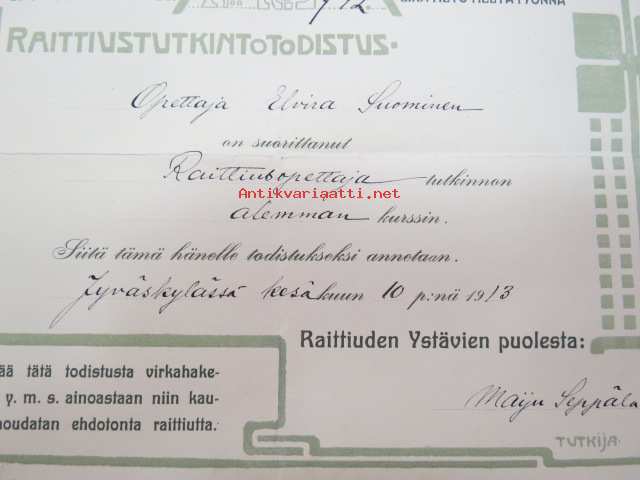 Raittiustutkintotodistus - Raittiusopettajatutkinto - alempi kurssi - (kansakoulunopettaja Elvi Suominen, 1891-1982 Turku), tutkinto suoritettu Jyväskylässä kesäkuun 10 p;nä 1913 "Ei oppi ojahan kaada - eikä tieto tieltä työnnä" - "Lupaan käyttää tätä todistutsta virkahakemuksissani yms. ainoastaan niin kauan kuin itse noudatan ehdotonta raittiutta" -sobriety certificate for school teacher