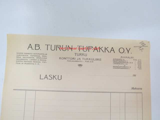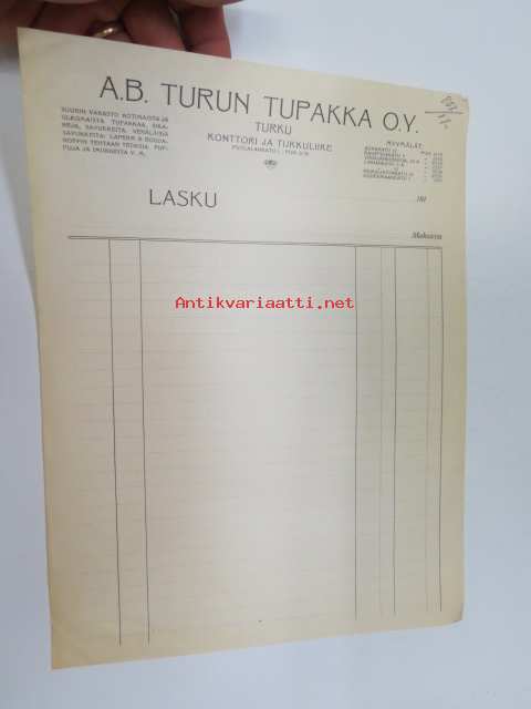 A.B. Turun Tupakka 1917 -asiakirja, kirjapainon arkistokappale, käyttämätön, painotyönumero ja vuosi merkitty / document