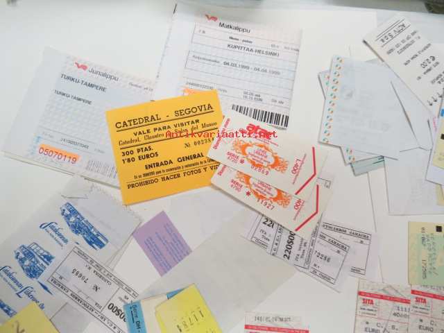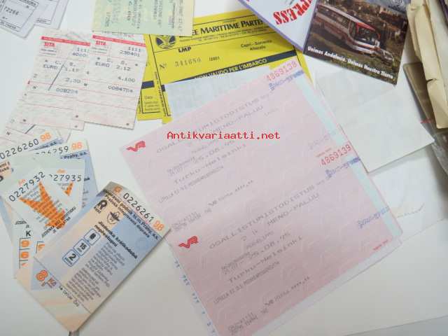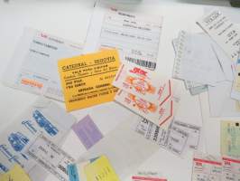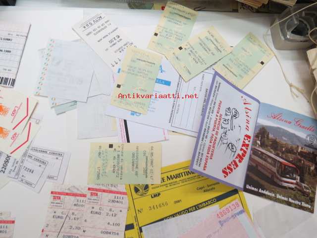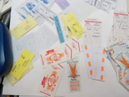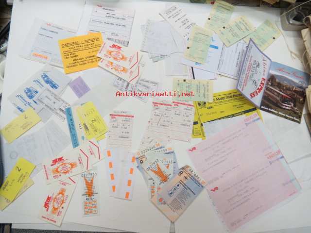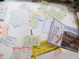 Erä erilaisia ulkomaisia matka- ja pääsylippuja -foreign travel and entrance tickets