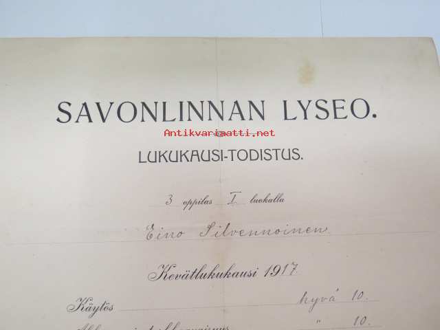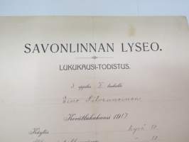 Savonlinnan Lyseo - Lukukausitodistus, 25.5.1917, Eino Johannes Silvennoinen -school certificate