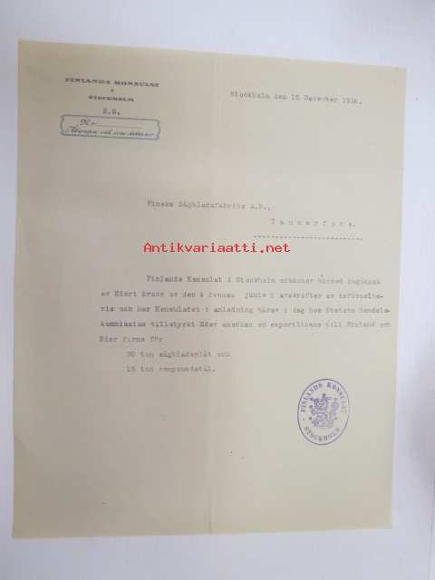 Finlands Konsulat i Stockholm, 10.12.1918, Suomen Sahanterätehdas Oy, Tampere -asiakirja -business document
