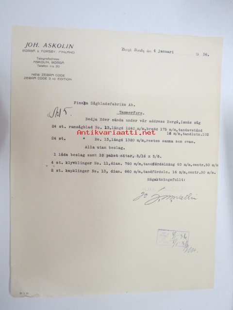 Joh. Askolin, Borgå & Forsby, 4.1.1936 - Suomen Sahanterätehdas Oy, Tampere -asiakirja -business document