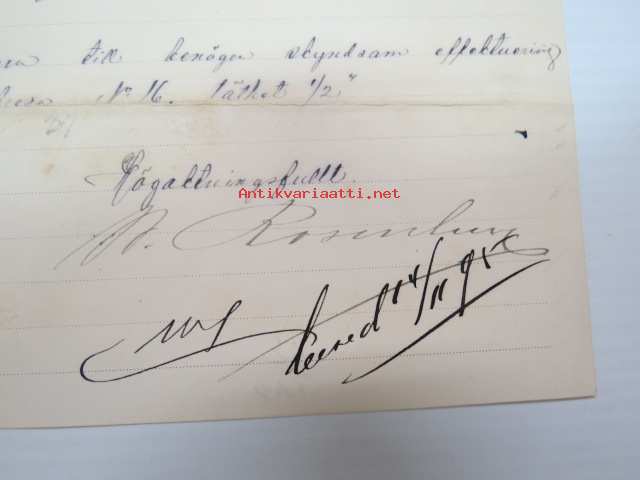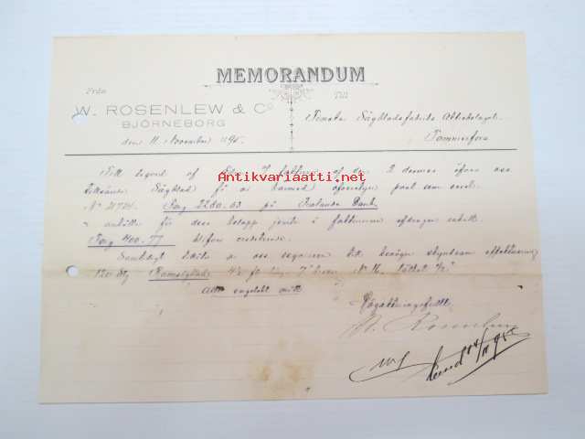 W.Rosenlew & Co Ab, Björneborg, 11.11.1895 - Suomen Sahanterätehdas Oy, Tampere -asiakirja, allekirjoitus W. Rosenlew -business document