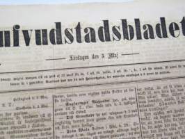 Hufvudstadsbladet Lördagen den 5 Maj 1866, innehåller bl.a följande artiklar / reklam / notiser; På börserna råder stor panique, Herr Wohllebe - blinde klarinetist ger gifver en konsert härstedes, Till Kronstadt har kommit fram genom isen twå ångfartyg och flere woro synliga, Olycklig lek i Tammerfors linnefabrik - två 12 års gossar under skurandet af golfvet råkade i en liten ordstrid som slutades så att den ena slog den andra med en damborste i sidan, med den påföljd att han genast tillsatte lifvet, Ångfartygstrafik etc. -newspaper
