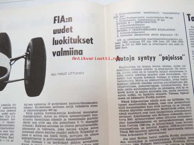 Moottoriurheilu 1965 nr 5, sis. mm. seuraavat artikkelit / kuvat, mainokset; Kansikuva Simca 1000, Jawa, Ruskeasanta, Neuvostoliiton kolmikko hallitsi Ruissalon ajoa, Näin on hoidettava moottoripyörää, Ducati 250 Monoalbero, Reima Lohkovuori, Turku Artukainen Sadan Auton ajot, Rusty Steele -sarjakuva, Puch Tunturi SR 150 scootteri, Mobiloil, Saab, ym. -motoring magazine21 x 30 cm.