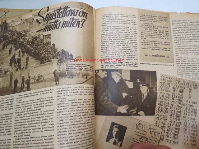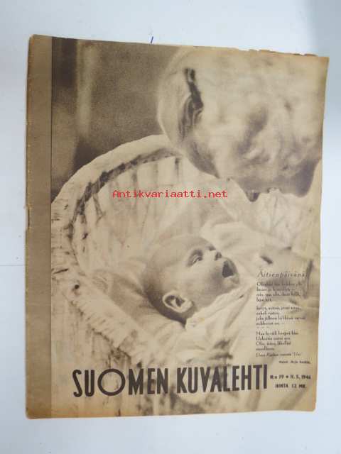 Yhtyneet Kuvalehdet Oy, 1946 Suomen Kuvalehti 1946 nr 19, ilmestynyt 11.5.1946, sis. mm. seur. artikkelit / kuvat / mainokset; Kansikuva "Äitien päivänä", Orion, Kupittaan Savi Oy, Ammattiopintojen tietä korkeakouluihin, Kiveliöitten äiti - Lapin saamelaisäitejä ja elämää - Kovalan kylä - 3 kotaa joissa asuu 20-30 henkeä,Helmi Lindelöfin pitkä teatteritaival, ALKO ja myymälätodistukset (viinakortit), ym. -weekly magazine 25 x 30 cm.
