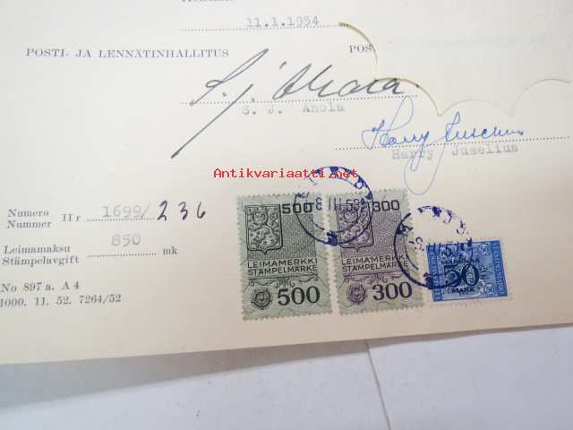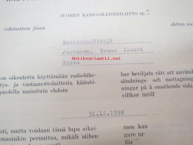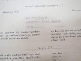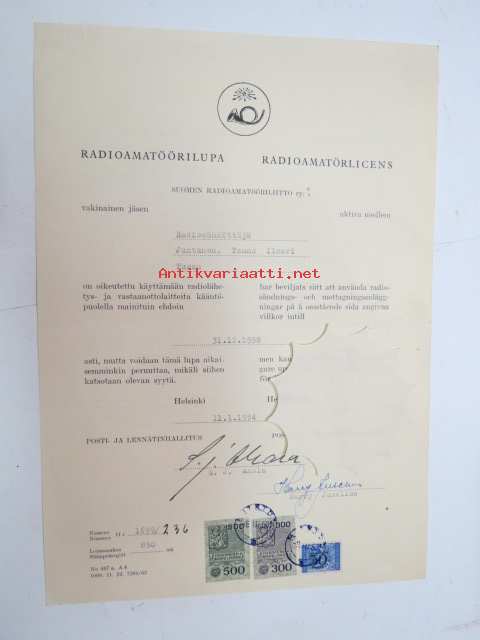 Radioamatöörilupatodistus, radiosähköttäjä Tauno Ilmari Juntunen, 11.1.1954, leimamerkit -radio amateur´s certificate with tax stamps