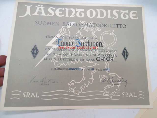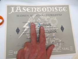 Jäsentodiste - Suomen Radioamatööriliitto ry - Tauno Juntunen, kutsumerkki OH10R, 10.11.1949 -radio amateur´s club certificate