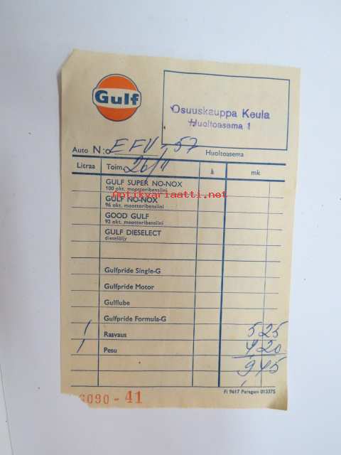 Gulf - Osuuskauppa Keula, Rauma, Huoltoasema 1, huoltoasemakuitti 26.2.1967 -receipt