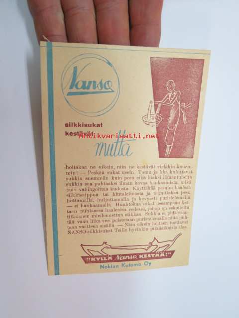 Nanso - Nokian Kutomo Oy - silkkisukat kestävät, mutta... hoito-ohjekortti -washing advice for silk stockings