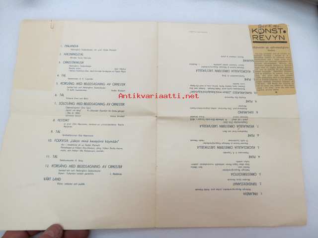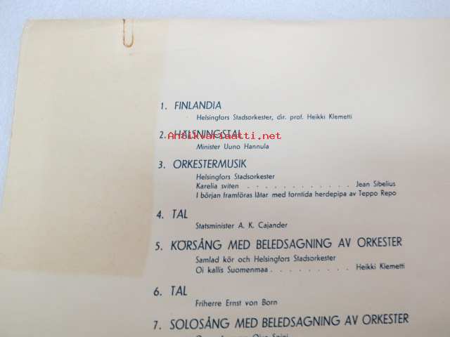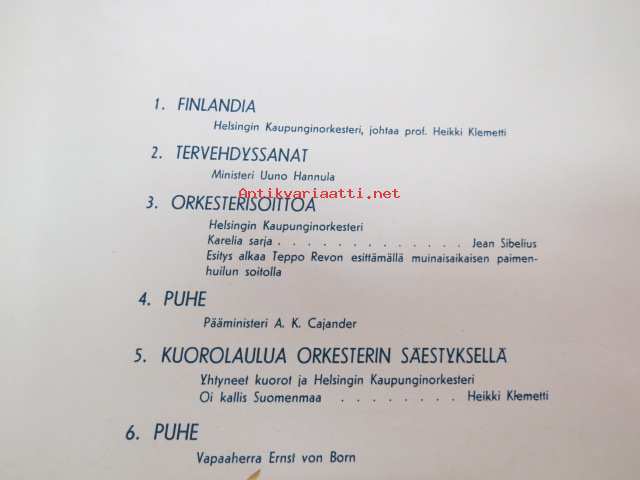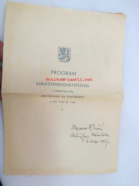 Ohjelma valtioneuvoston järjestämässä itsenäisyysjuhlassa Messuhallissa 6. XII. 1937 klo 15.00 - Program för självständighetsfesten i Mässhallen, anordnad av statsrådet 6. XII. 1937 kl 15.00 -ohjelmalehtinen, ollut Werner Wirénin kappale -festivities of ndependence day, program