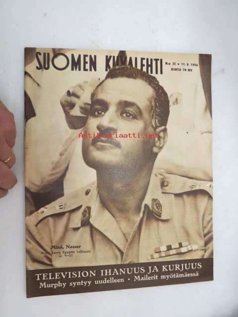 Suomen Kuvalehti 1956 nr 32, ilmestynyt 11.8.1956, sis. mm. seur. artikkelit / kuvat / mainokset; Kansikuva "Minä - Nasser - Fallujan Tiikeri", Ranska ei halua uhrata Afrikkaa, Television ihanuus ja kurjuus, Mailerimme menopäällä, Bridey Murphy ja uudestisyntymisoppi, Rahapajan ahdinko, ym. -weekly magazine
